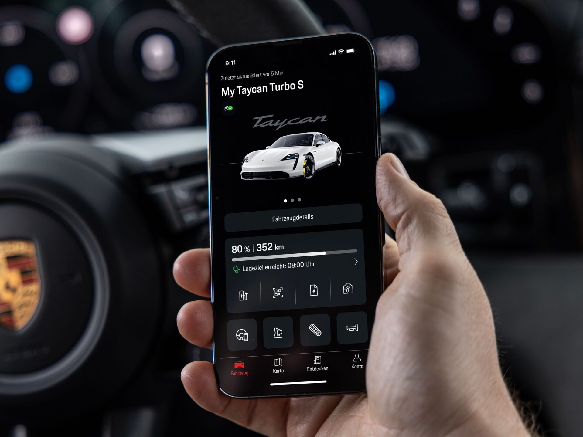 Mit der My Porsche App und den Diensten von Porsche Connect (länderspezifisch verfügbar) lassen sich verschiedene Fahrzeugfunktionen bequem aus der Ferne bedienen. Über die App sind Informationen zur Lage und Verfügbarkeit der Ladestationen sowie zum Preis eines Ladevorgangs in Echtzeit verfügbar.
